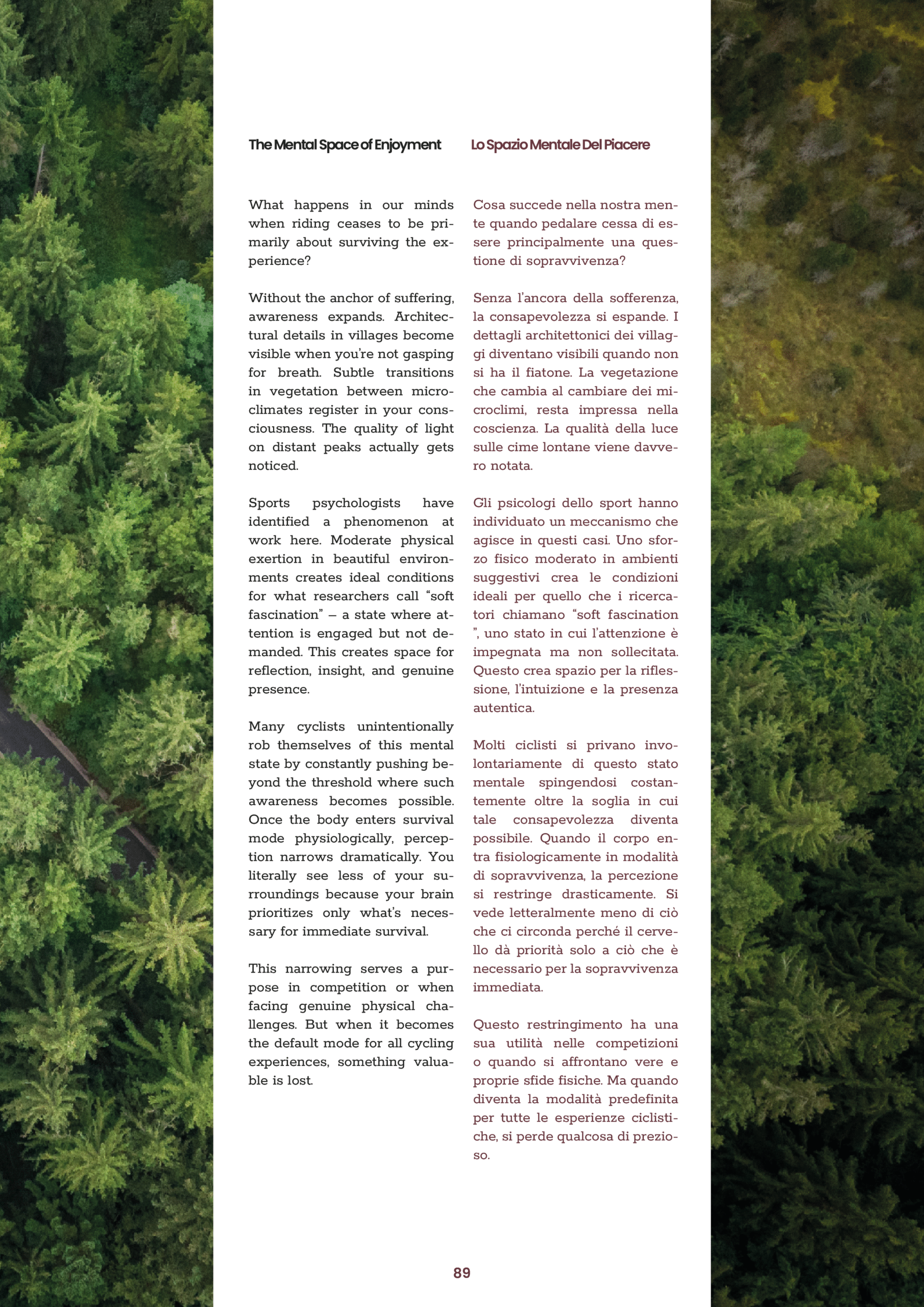 I started by designing a grid system that would guide every spread, creating structure and consistency across such a large publication. The grid allowed me to balance text, photography and maps in a way that kept each page dynamic but coherent. It also made it easier to manage the two languages side by side, ensuring both were clearly visible and easy to follow, without one overpowering the other.